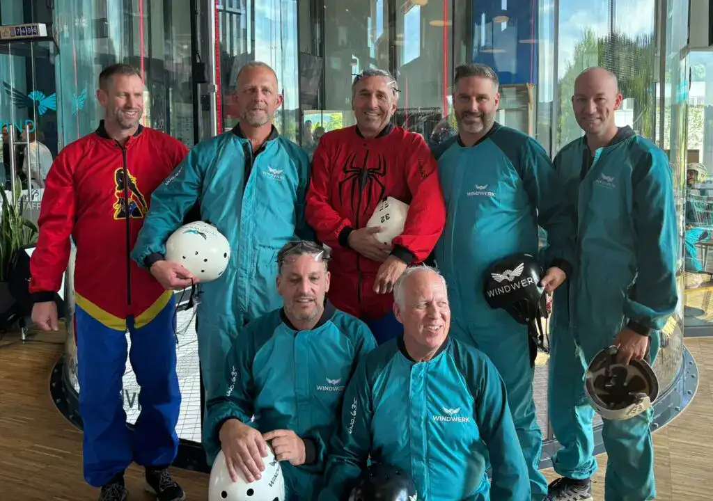 Nach einer kurzen und klaren Instruktion durften wir unsere schönen Flieger-Overalls anziehen. Mit Helm und Schutzbrille versehen, ging es dann schon Richtung Windkanal.