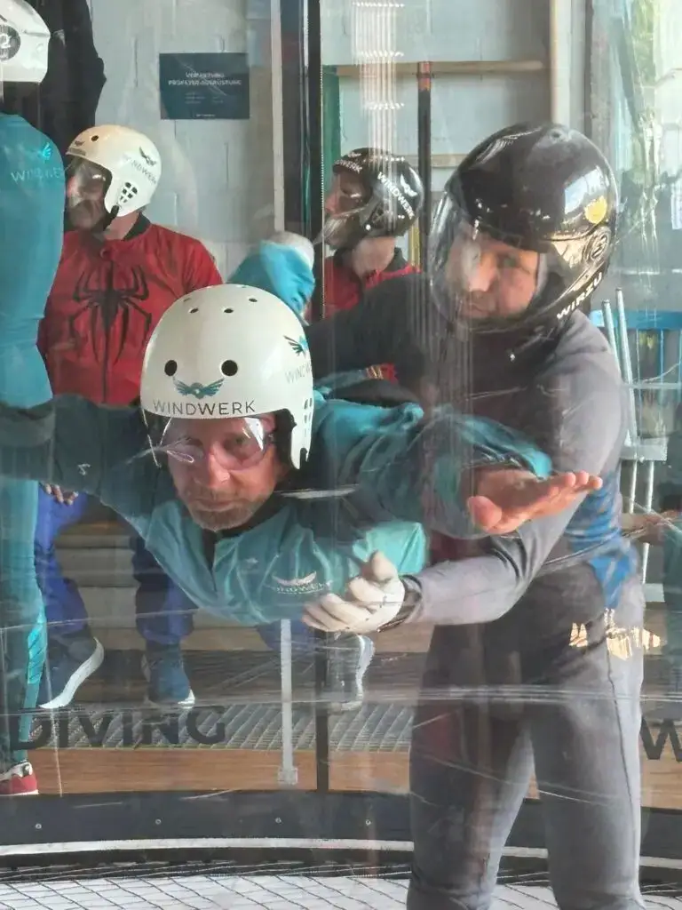 Und es war wieder einmal etwas aus der Kategorie das-hätte-ich-nie-gemacht-wenn-ich-nicht-an-einem-Drü-Weekend-dazu-eingeladen-worden-wäre. Im Windwerk konnte man nämlich in einer runden Glasröhre (sozusagen ein senkrechter Windkanal) fliegen lernen. Okay fliegen konnten die meisten von uns schon recht gut. Aber meist war das unfreiwillig und die Landung war selten besonders schön anzusehen.