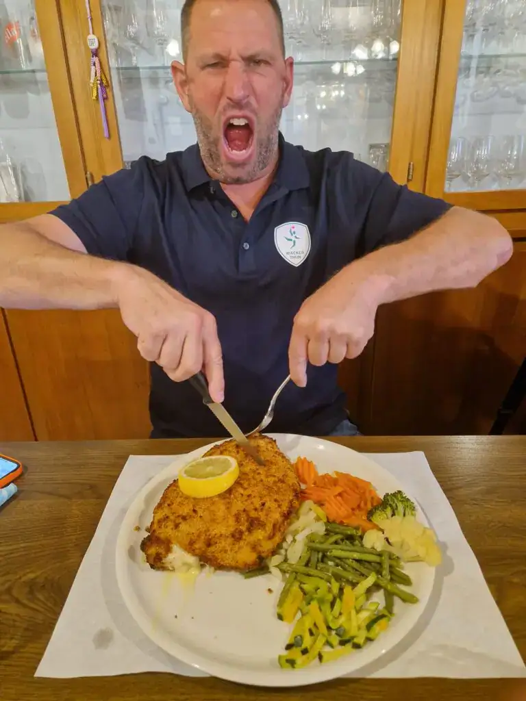 In Luterbach SO bezogen wir dann unsere Zimmer. Kurz darauf sassen mir beim nächsten Getränk und dann ging es auch schon los Richtung Restaurant Frohsinn in Etziken SO. Dieses Lokal machte seinem Namen alle Ehre. Es handelte sich um so einen richtigen geselligen Dorfgasthof mit lauter fröhlichen jungen und älteren Gästen. Bei bester Stimmung ging es dann darum sich zwischen 300, 500, 800 oder 1200 Gramm Gordon bleu zu entscheiden. Ich will es nicht verpassen die äusserst zuvorkommende einheimische Bedienung zu rühmen, die angeblich ja eben nicht aus der Innerschweiz stammte. I säge Üch…! Massiv überfressen (ein paar Dinge werden sich nie ändern), nach wenig Wein und nach noch weniger Berliner Luft ging es dann darum sich zu verabschieden. Unsere Gastgeberin Maya pflegte das sehr ausführlich und mit viel Herz (oder so). Böndli stellte sich freundlicherweise gerne zur Verfügung. Mayahiiii, Mayahooo, Mayahüüüü… Merci, Kusi!